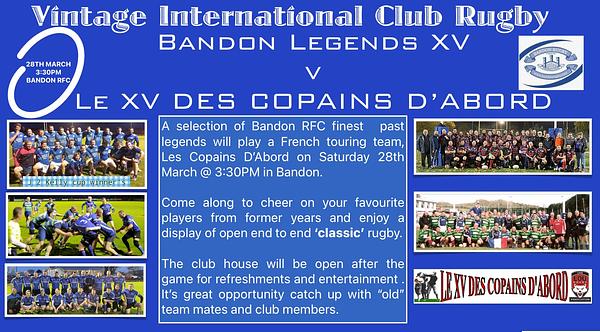 As an appetizer (or amuse bouche!!) before the big Pan-Munster final this coming Sunday, a team of Bandon rugby legends is taking on the mighty Le XV Des Copains D'Abord, a touring French side, this Saturday, March 28th, at 3:30PM in Old Chapel. Please come out a cheer on our masters...or indeed the French visitors!! Fun and frolics guaranteed. Players and supporters can enjoy well-earned drinks and refreshments after the game in the clubhouse, while sharing tales of rugby exploits over the years!! Bonne chance to the two sides!